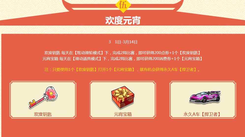 欢度钥匙 每天在【炫动滑轮模式】下,完成2局比赛,即可获得200点券+1个【欢度钥匙】