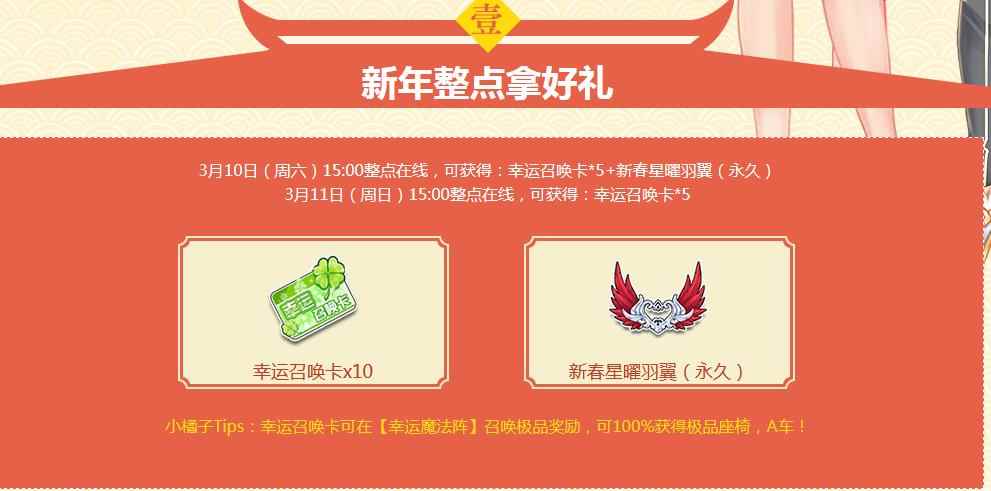 3月10日(周六)15:00整点在线,可获得:幸运召唤卡*5+新春星曜羽翼(永久)