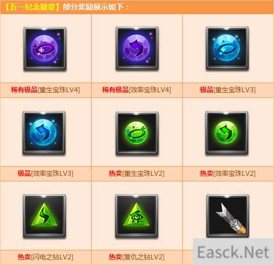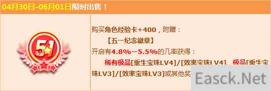 购买角色经验卡+400,附赠【五一纪念徽章】,获赠稀有极品【重生宝珠LV4】/【效率宝珠LV4】、极品【重生宝珠LV3】/【效率宝珠LV3】或其他宝石!