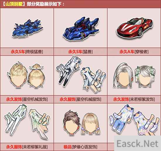 活动期间,购买角色经验卡+900,附赠【山顶别墅】,有机会获得:永久S车【终极猛兽】/【猛兽】、永久A车【穿梭者】、极品【星空机械发饰/服饰】/【未若柳絮发饰/礼服】、极品【梦缘心语发饰/礼服】或其他奖励之一!