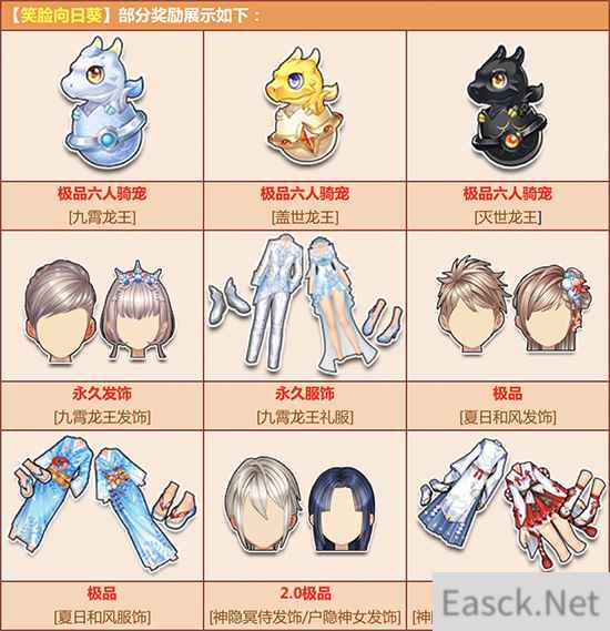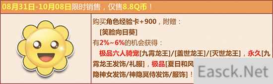 活动期间,购买角色经验卡+900,附赠【笑脸向日葵】,有机会得六人骑宠【九霄龙王】/【盖世龙王】/【灭世龙王】、永久【九霄龙王发饰/礼服】、极品【夏日和风发饰/服饰】、2.0极品【户隐神女发饰/神隐冥侍发饰/服饰】或其他奖励之一!