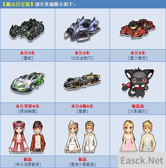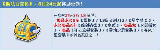 【魔法百宝箱】,8月24日起奖励更新!开启有几率获得:极品永久S车【雷蛇】/【S白金剃刀】/【星之精灵】、永久极品A车【绿剑销魂】/【皇爵】、极品宠【火影猫女】、极品【祥云流樱套装】/【雪地少尉套装】/【春风十里套装】或其他奖励之一!