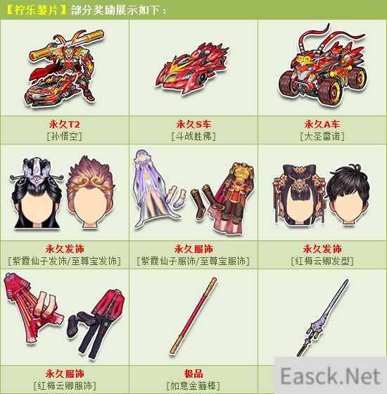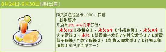 活动期间,购买角色经验卡+900,获赠:柠乐薯片,开启有几率获得:永久T2【孙悟空】、永久S车【斗战胜佛】、永久A车【大圣雷诺】、永久【紫霞仙子发饰/至尊宝发饰】/【紫霞仙子服饰/至尊宝服饰】/【红梅云卿发型】/【红梅云卿服饰】或其他奖励之一!