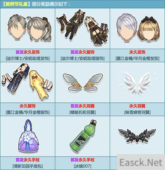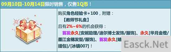 教师节礼盒 活动时间:9月10日-10月14日 活动地址:游戏商城 一、活动内容 活动期间,购买角色经验卡+100,附赠【教师节礼盒】,有机会获得:首发永久【安妮助理发饰/迪尔博士发饰/服饰】、永久【华月金橙发型/墨江金穗发型/服饰】、极品【蜻蜓机轮羽翼】/【清新田园手提包】/【冰镇007】或其他奖励之一! 核心奖励永久型概率是:2%-4% 获得核心奖励期限型概率是:4%-6% 获得非核心奖励概率是:90%-94%