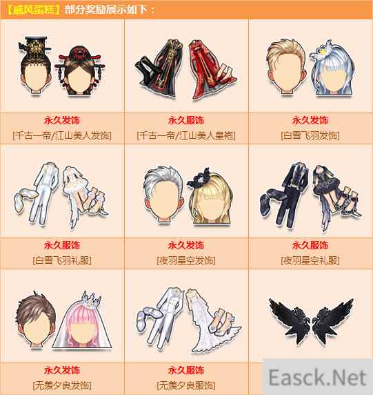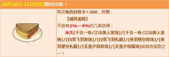 10月18日-11月25日期间,购【角色经验卡+300】,赠送戚风蛋糕,有机会得永久【千古一帝/江山美人发饰】/【千古一帝/江山美人皇袍】/【白雪飞羽发饰】/【白雪飞羽礼服】/【夜羽星空发饰】/【夜羽星空礼服】/【无羡夕良发饰】/【无羡夕良服饰】或其他奖励之一!