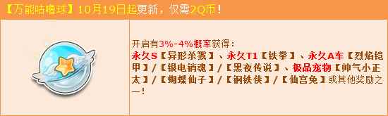 10月19日起,万能咕噜球奖励大更新,开启有概率获得:永久S【异形杀戮】、永久T1【铁拳】、永久A车【烈焰铠甲】/【银电销魂】/【黑夜传说】、极品宠物【帅气小正太】/【蝴蝶仙子】/【钢铁侠】/【仙宫兔】或其他奖励之一!