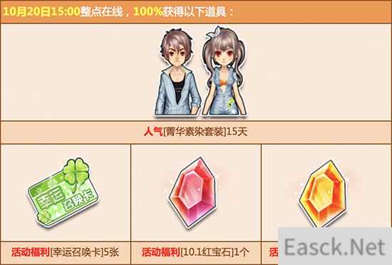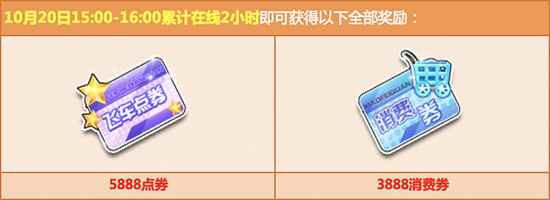 《QQ飞车》10月20日15:00游戏整点在线,即可领取欢乐幸运币专属宝石、人气套装以及幸运召唤卡5张,另外累计在线2小时,还可100%获得5888点券、3888消费券。