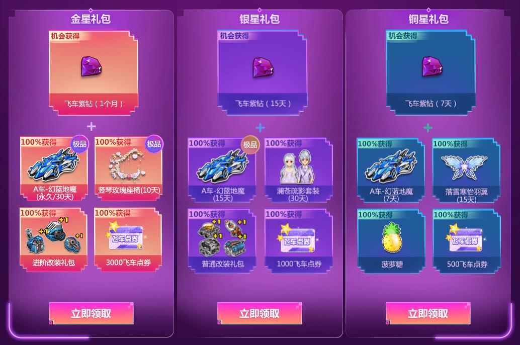 2、幸运星紫钻特权随心享:活动期间,符合身份的玩家可以领取对应身份的礼包(领取前请先关闭紫钻自动续费功能,否则可能导致奖励发放失败),单Q只可以领取其中1个礼包1次;