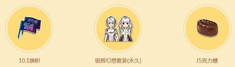 每天赠送10个【10.1旗帜】,只要挂上此旗帜,在19:00-21:00参加游戏,即有机会可获得银辉幻想套装(永久)、巧克力糖等精彩奖励!