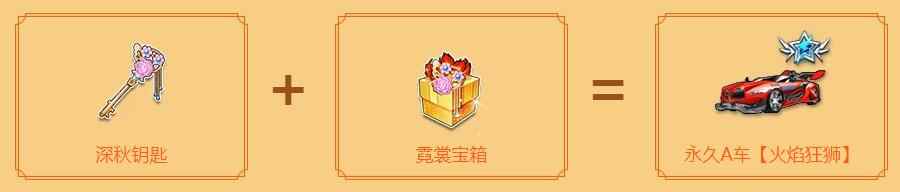 注:只要使用1个【深秋钥匙】打开1个【霓裳宝箱】,就有机会获得永久A车【火焰狂狮】
