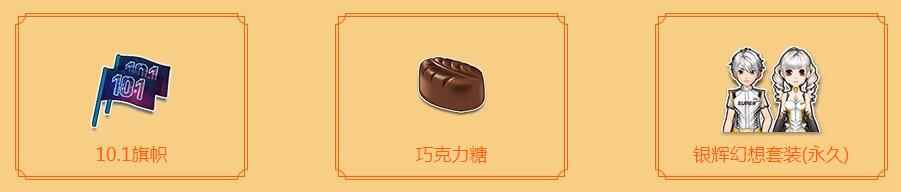 每天赠送10个【10.1旗帜】,只要挂上此旗帜,在19:00-21:00参加游戏,即有机会可获得银辉幻想套装(永久)、巧克力糖等精彩奖励!