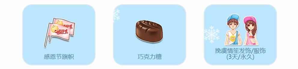 每天赠送10个【感恩节旗帜】,只要挂上此旗帜,在19:00-21:00参加游戏,即有机会可获得挽虞情笙发饰/服饰(永久)、巧克力糖等精彩奖励!
