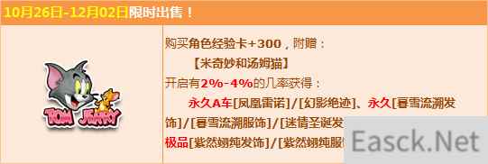 活动期间,购【角色经验卡+300】,赠送【米奇妙和汤姆猫】,有机会得永久A车【凤凰雷诺】/【幻影绝迹】、永久【暮雪流溯发饰】/【暮雪流溯服饰】/【迷情圣诞发饰】/【迷情圣诞礼服】或其他奖励之一!