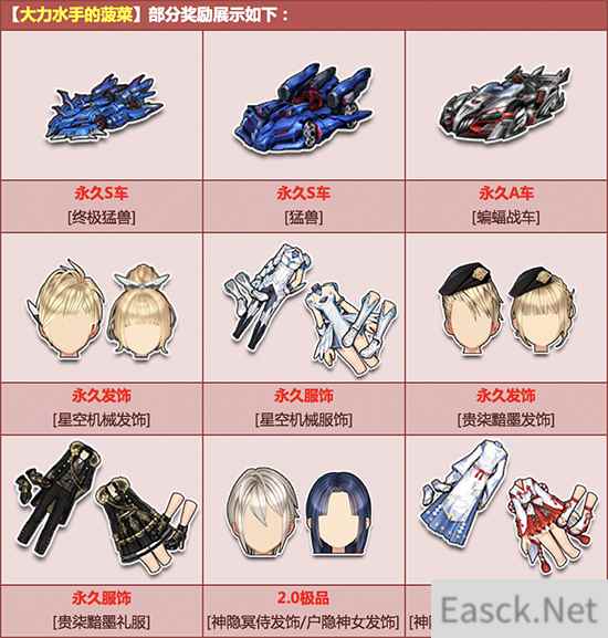 活动期间,购买角色经验卡+900,有机会得永久S车【终极猛兽】/【猛兽】、永久A车【蝙蝠战车】、永久【星空机械发饰/服饰】/【贵柒黯墨发饰/礼服】或其他奖励之一!