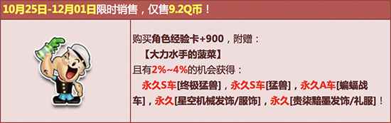大力水手上阵,齐赴永久S车猛兽之约!活动期间,凡购买【角色经验卡+900】将附赠大力水手的菠菜,开启即可有机会获得永久S车、永久A车等丰厚奖励。下面一起来看看吧。