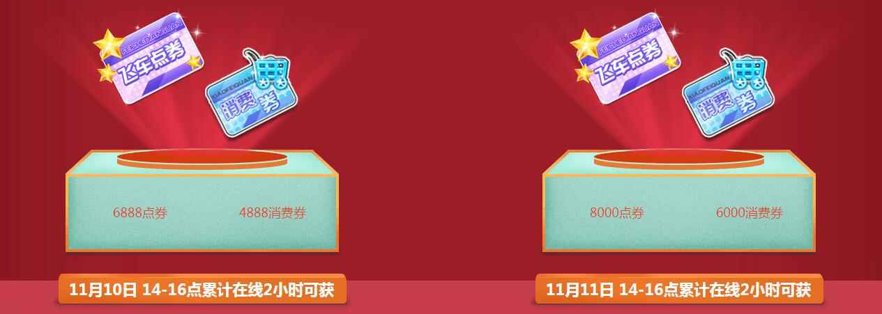 11月10日-11月11日,全天24小时在【竞速模式】释放氮气、漂移既有机会获得1Q币、2Q币、5Q币、10Q币、15Q币、20Q币、100Q币代金券!注:多跑多得,尽情的狂飙获得代金券吧!