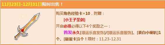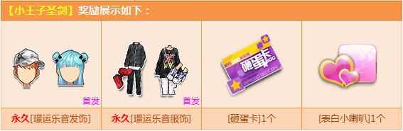 活动期间,购【角色经验卡+10】,赠送【小王子圣剑】,打开必得以下4个奖励之一:首发永久【璟运乐音发饰】/【璟运乐音服饰】、【表白小喇叭】1个、【砸蛋卡】1个!