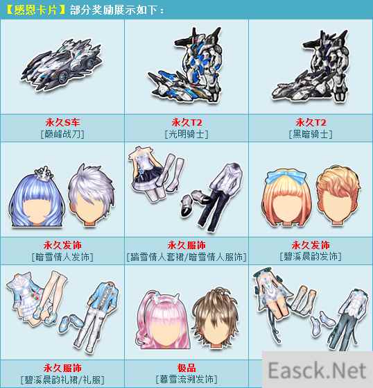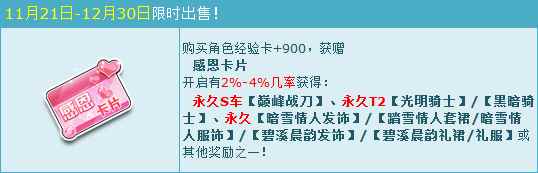 活动期间,购买角色经验卡+900,获赠感恩卡片,开启有几率获得:永久S车【巅峰战刀】、永久T2【光明骑士】/【黑暗骑士】、永久【暗雪情人发饰】/【踏雪情人套裙/暗雪情人服饰】/【碧溪晨韵发饰】/【碧溪晨韵礼裙/礼服】或其他奖励之一!