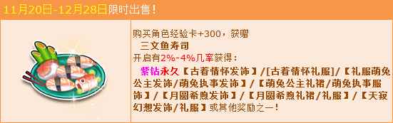活动期间,购买角色经验卡+300,获赠:三文鱼寿司,开启有几率获得:紫钻永久【古着情怀发饰】/[古着情怀礼服]/【礼服萌兔公主发饰/萌兔执事发饰】/【萌兔公主礼裙/萌兔执事服饰】/【月圆希煦发饰】/【月圆希煦礼裙/礼服】/【天寂幻想发饰/礼服】或其他奖励之一!