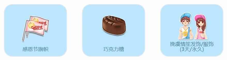 每天赠送10个【感恩节旗帜】,只要挂上此旗帜,在19:00-21:00参加游戏,即有机会可获得挽虞情笙发饰/服饰(永久)、巧克力糖等精彩奖励!