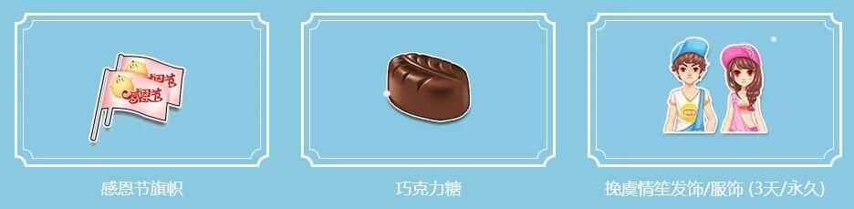 每天赠送10个【感恩节旗帜】,只要挂上此旗帜,在19:00-21:00参加游戏,即有机会可获得挽虞情笙发饰/服饰(永久)、巧克力糖等精彩奖励!