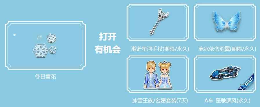 11月30日-12月2日,在冰雪企鹅岛、雪域冰城、雪地大冒险、极地冰镇地图中参与一次跑图,有机会获得冬日雪花。