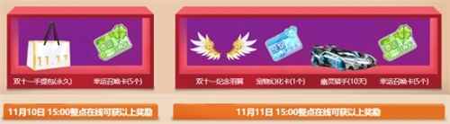 狂欢三:整点送永久 纪念羽翼免费领 狂欢节期间,怎能少得了专属纪念礼物。11月10日15:00整点在线,就能轻松领取永久双十一手提包和5个幸运召唤卡;双十一当天15:00整点在线,必得双十一纪念羽翼、幽灵猎手(10天)、宠物幻化卡和幸运召唤卡。快来和大家一起狂欢吧!