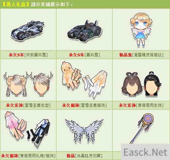 活动内容:购买角色经验卡+900,赠送:愚人礼盒,有几率获得:永久S车【终极暴风雪】/【暴风雪】、极品宠【凝露精灵珞丽丝】、永久【星雪圣麋发型】/【星雪圣麋服饰】/【青偌思雨发饰】/【青偌思雨礼裙/服饰】或其他奖励之一!获得核心奖励永久型概率是:2%-4%,获得核心奖励期限型概率是:4%-6%,获得非核心奖励概率是:90%-94%。