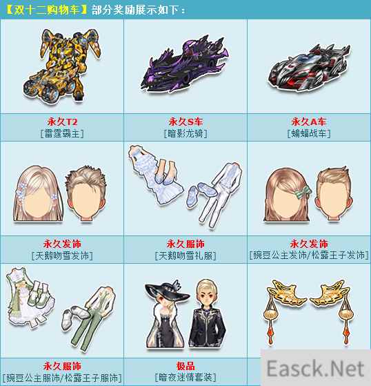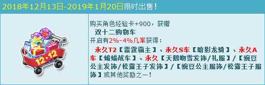 活动期间,购买角色经验卡+900,获赠:双十二购物车,开启有几率获得:永久T2【雷霆霸主】、永久S车【暗影龙骑】、永久A车【蝙蝠战车】、永久【天鹅吻雪发饰/礼服】/【豌豆公主发饰/松露王子发饰】/【豌豆公主服饰/松露王子服饰】或其他奖励之一!