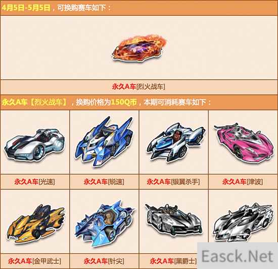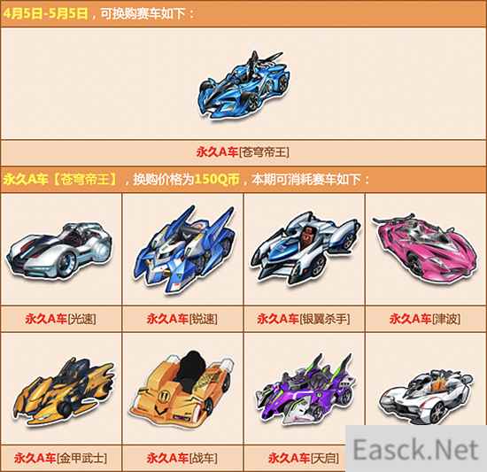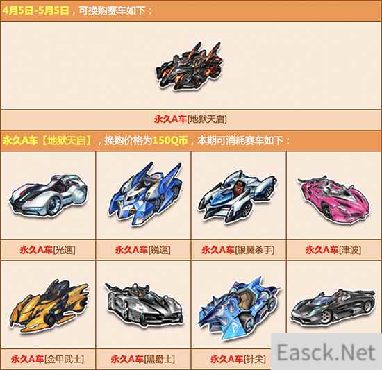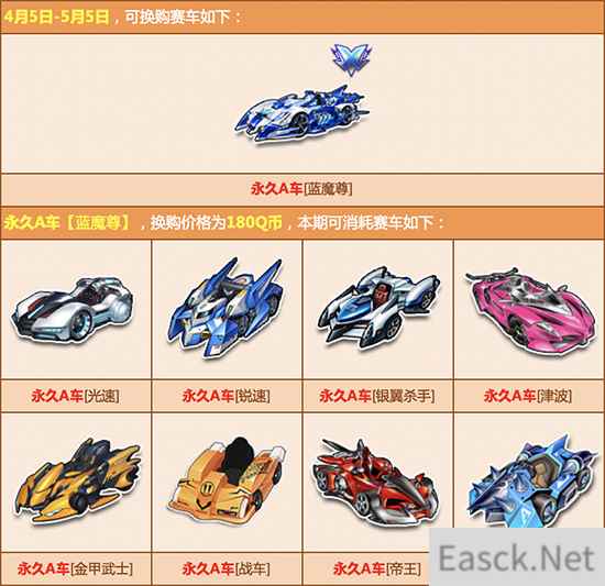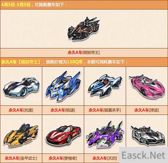 活动内容:赛车换购计划新赛季开启,本期开启可换购永久A车为【雷怒帝王】、【蓝魔尊】、【地狱天启】、【烈火战车】、【苍穹帝王】、【暗狱帝王】,参与即可100%换购成功,喜欢的玩家千万不要错过哦!