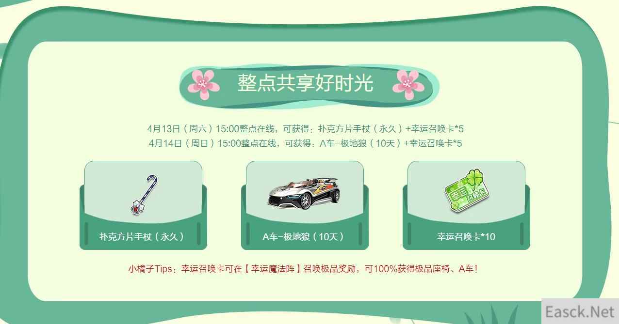 《QQ飞车》春和景明活动 整点共享好时光,4月13日至4月14日,整点在线即可领取永久扑克方片手杖和限时A车极地狼,小伙伴是不是很动心呢,快来和小编一起看看。