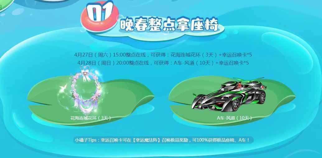 《QQ飞车》绿肥红瘦活动地址 活动时间:4月27日~4月28日 活动地址:点击进入 活动内容: 1、晚春整点拿座椅