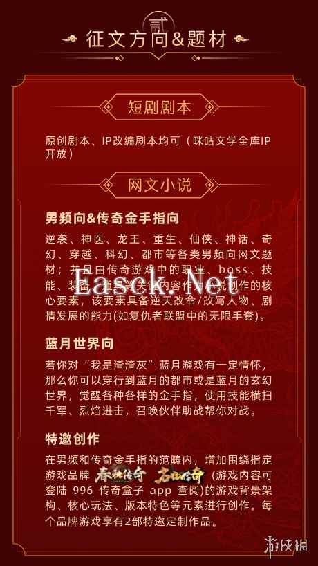 题材全开,全民参与 主办方给了老铁们脑洞大开的机会,也仙人指路提示了方向。整个征文赛分传奇短剧创作和传奇小说两个部分。剧本类题材不限,可以放手写短剧剧本、原创剧本、IP改编剧本均可(咪咕文学全库IP开放)。 网文小说有三个题材方向:“男频向&传奇金手指向”、“蓝月世界向”及“996人气服特邀创作”。在“男频向&传奇金手指向”中,逆袭、神医、龙王、重生、仙侠、神话、奇幻、穿越、科幻、都市等各类网文题材都可以切人,叫人相当跃跃欲试。 另外,如果对“我是渣渣灰”蓝月游戏有一定情怀,那么就可以穿行到蓝月的都市或是蓝月的玄幻世界,觉醒各种各样的金手指,使用技能横扫千军、烈焰进击,召唤伙伴助战帮你对战,在故事里展开“蓝月世界向”方向的大宏图。 而特邀创作,是在男频和传奇金手指的范畴内,增加围绕“春秋传奇”、“名扬传奇十五职业”这两款996传奇盒子人气服的背景架构、核心玩法、版本特色等元素进行创作。对这两个游戏特别有感觉的作者,有机会放胆过来大书异梦了。
