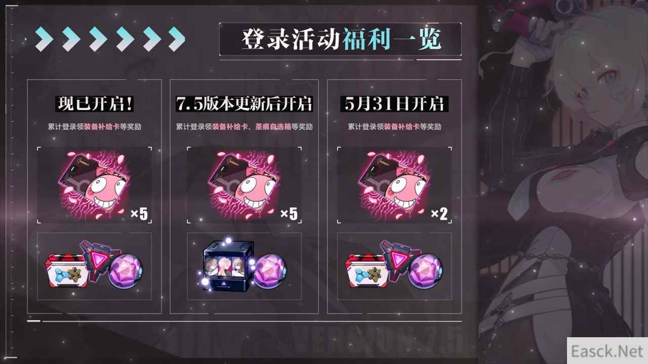 此外,服装商城也将开启限时折扣,共计18件人气夏装限时复刻上架,欢迎舰长前往选购心仪服装。 新版本特别福利,参与即领丰厚奖励 7.5版本同样将开启系列福利活动:参与累计登录活动即可领取装备补给卡、「破弃孤光·逐影」圣痕自选箱等奖励;参与累充活动还可获得武器直升券、「真我·人之律者」「戒律·深罪之槛」晋升印章、根源棱镜、补给卡、加速券等福利。