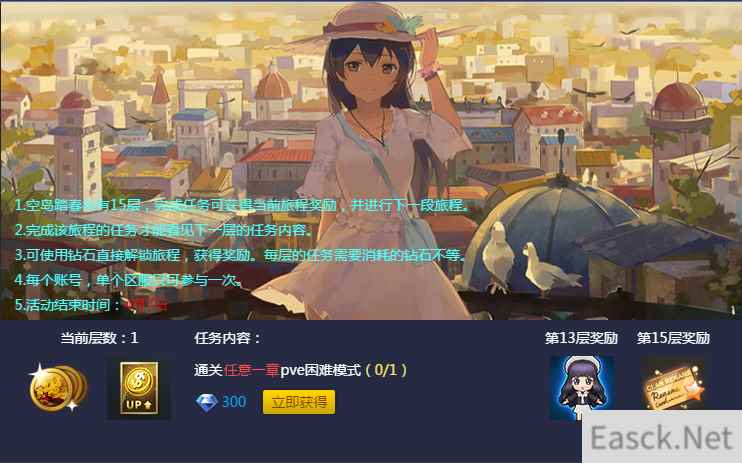 活动三:空岛踏春 活动时间:3月29日 11:00-4月7日 活动规则:活动期间内完成任务,即可获得对应的活动奖励,第十三层赠送限定宠物-知世,第十五层赠送超级改名卡,仅可领取一次。