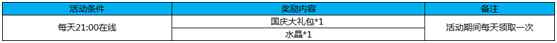 超赞福利!9月28日-10月7日!连续10天!不分区服任何玩家每日21点在线都可获得国庆大礼包*1(概率获得限定技能卡,专属武器自选礼包)。