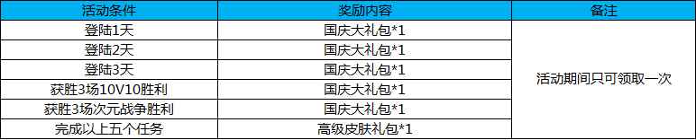 活动规则: 每日登陆都可领取国庆大礼包*1,获胜3场10V10和次元战争即可领取国庆大礼包*1。完成五个任务还可额外获得高级皮肤礼包*1