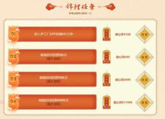 2020年3月23日-2020年5月5日 进入梦工厂APP直播间1分钟可领取回馈礼包;2020年3月23日-2020年5月4日 在梦工厂视频房间消费过炫贝的玩家,消费后隔天可领取回馈礼包;每个礼包单Q限领1次哦。