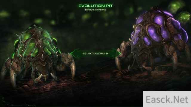 玩家可为每个单位选择不同的变异 首先,异化可以让你的单位拥有与众不同的能力。让我们以虫族最基础的单位跳虫(Zergling)为例,如果你喜欢快速闪击对手,你可以让跳虫获得快速移动的能力;如果你希望它们能制造更多的伤害,那么可以让跳虫获得更快的攻击速度;如果你希望它们存活时间更久一些为敌人造成更多威胁,可以提升它们的生命值。每个单位的异化选项都不同,而且玩家可以根据关卡、战术配合或喜好随时改变这些能力。 毒爆虫甚至可以进化出爆炸之后放射出的酸液可以治疗己方单位的能力,十分有趣。各种各样的异化能力配合进化,将会让玩家得到全新的虫群单位。 进化产生的结果和异化获得的锦上添花的能力完全不同。进化可以改变甚至创造出完全不同的兵种,即便是跳虫这样最基本的虫群生物也会发生巨变。这个变化是永久的,无法逆转的。两种虫群单位的变化方式结合,玩家将在游戏中拥有完全属于自己定制的异虫大军。