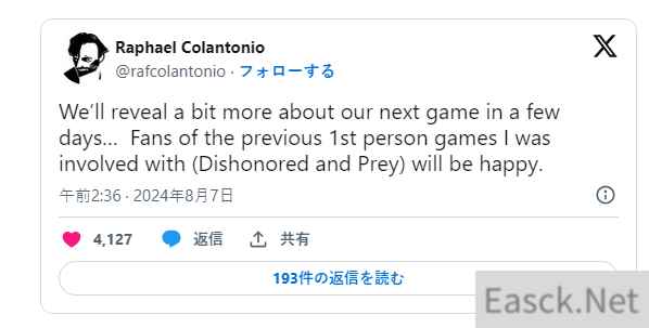 曾经开发了《耻辱》、《Pray》的Arkane Studios工作室创始人之一Raphael Colantonio日前透露新情报,将于近期公开一款第一人称新游,敬请期待。 ·Raphael Colantonio表示,这款游戏或许会让《耻辱》、《Pray》的玩家粉丝们惊喜,敬请期待后续消息吧。