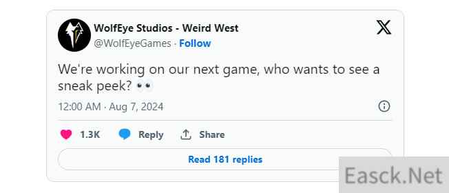 WolfEye成立后的首个作品——《诡野西部》于2022年发售,这款黑暗幻想游戏是一款上帝视角动作RPG,在多个平台获得了媒体的好评—— 76 (PC),73 (PS4), 81 (Xbox One)。 今年3月Colantonio开始为他的下一个游戏预热,当时透露这是一款“复古科幻第一人称RPG”。而在近日,他又在X上预热这款新作,称《耻辱》和《掠食》系列的粉丝会非常高兴看到这款游戏。 他说:“我们将在未来几天内透露一点我们的新作。我之前参与开发的第一人称游戏——《耻辱》和《掠食》的粉丝们将会非常高兴。”