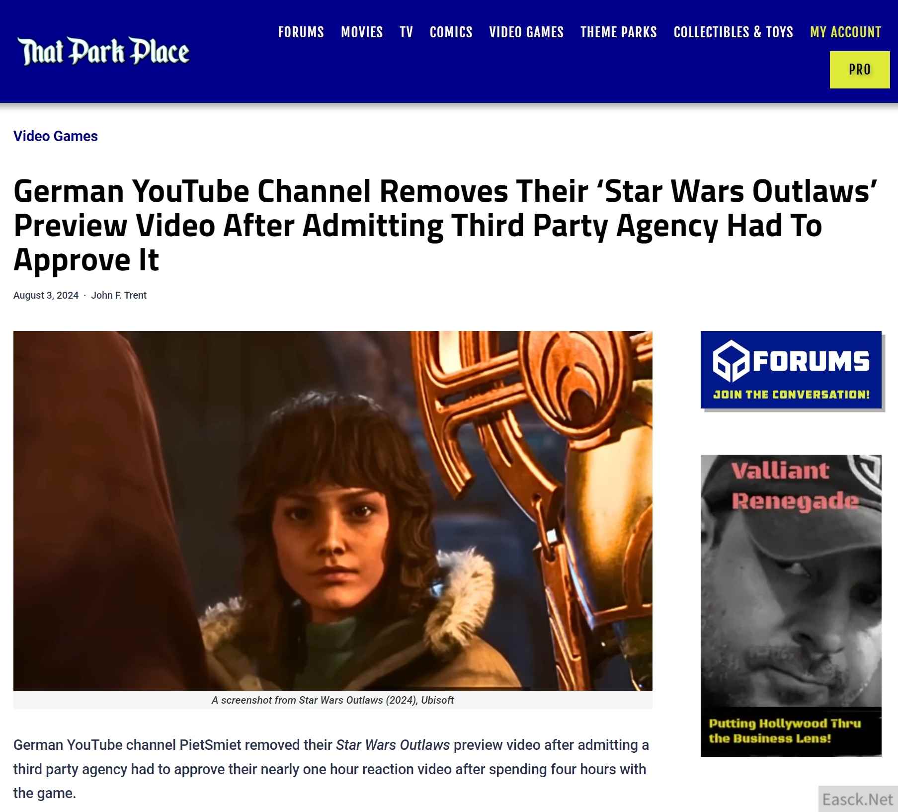此外,有推主爆料,当德国一名自媒体发布了《星球大战:法外狂徒》不太好的最终前瞻视频时,德国一个第三方机构联系到了他们,要求他修改视频。而这个第三方机构显然是育碧委托的。 推主Grummz:“《星球大战:法外狂徒》每一个最终前瞻都经过育碧的某种审核。有些是通过第三方公司完成的,比如德国的这家公司。 其他的则是单纯的“访问式”预览,潜台词就是:对游戏客气点,你可以提一些小缺点来显得更真实,但记住,我们一直在看着你。 每个3A游戏公关部门的工作都是打电话给那些说了负面言论的Youtuber和up主,提醒他们下一次有很棒的免费旅行可以邀请他们,只要他们能“修正视频里说的那一点小问题”。