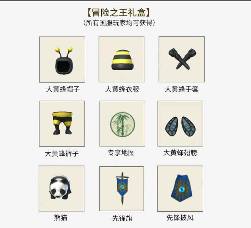 传送门骑士国服大礼包 冒险之王礼盒 获得途径:所有国服版玩家均可获得。 礼包内容:大黄蜂时装套装、宠物“熊猫”、先锋冒险家道具、专享限量地图开放。