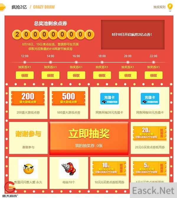 共同瓜分2亿点券,免费赢取多样福利,玩家们只需在18、19两日准时登陆页面便能领取对应数量的818网游节抽奖券并进行抽奖,只要运气在线就能轻松赢取盛大游戏点券、点券抵用券、网鱼网咖充值卡以及各类游戏道具、游戏周边奖励。