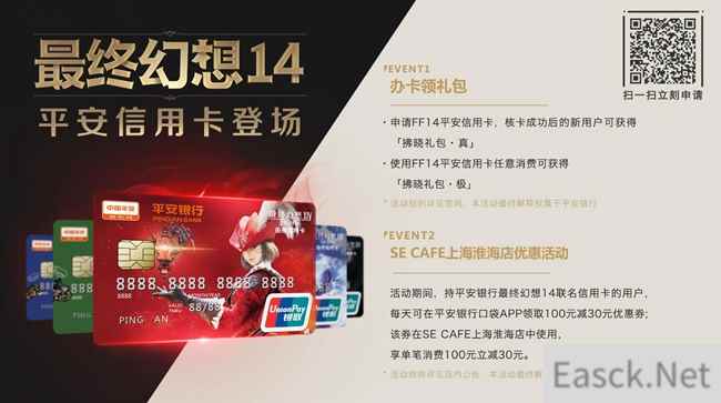 《最终幻想14》在国服四周年之际,也公布了最新的联名信用卡活动,活动期间,持平安银行最终幻想14联名信用卡的用户,每天可在平安银行口袋APP领取100元减30元优惠券,该券在SE CAFE上海淮海店中使用,享单笔消费100元立减30元。