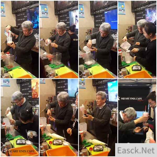 SE CAFÉ迎来一周年庆典 在对莅临的嘉宾及特邀玩家们进行了简单而隆重的介绍之后,桥本先生和来宾们移步至餐厅水吧区域,在工作人员的指导下,由桥本先生制作了两杯本次《最终幻想15》主题的新品饮料。在店员指导后,两杯饮料也顺利制作完成,这也是桥本先生首次为玩家制作饮品,口味上更是获得了两位被抽中品尝的幸运玩家的交口称赞。