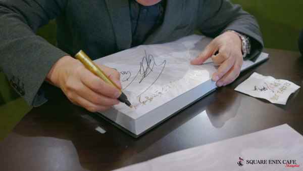 SE CAFE一周年蛋糕 试吃环节之后是牵动众多粉丝的抽奖环节,我们此前作为周年庆的前置活动推出了纪念章预售活动,凡是参加预售活动的客人都能获得抽奖机会,奖品从终身免费试吃、PS4主机,到游戏制作人签名周边、周年纪念马克杯,可谓好礼多多诚意满满,也是我们对一直以来支持我们的玩家朋友们的感恩和回馈。桥本先生也在抽奖环节之后与现场来宾们签名合影,收到玩家递上的一件件精心准备的签名周边,桥本先生有惊喜有感动,深切地感受到了中国的SE粉丝们的热情。