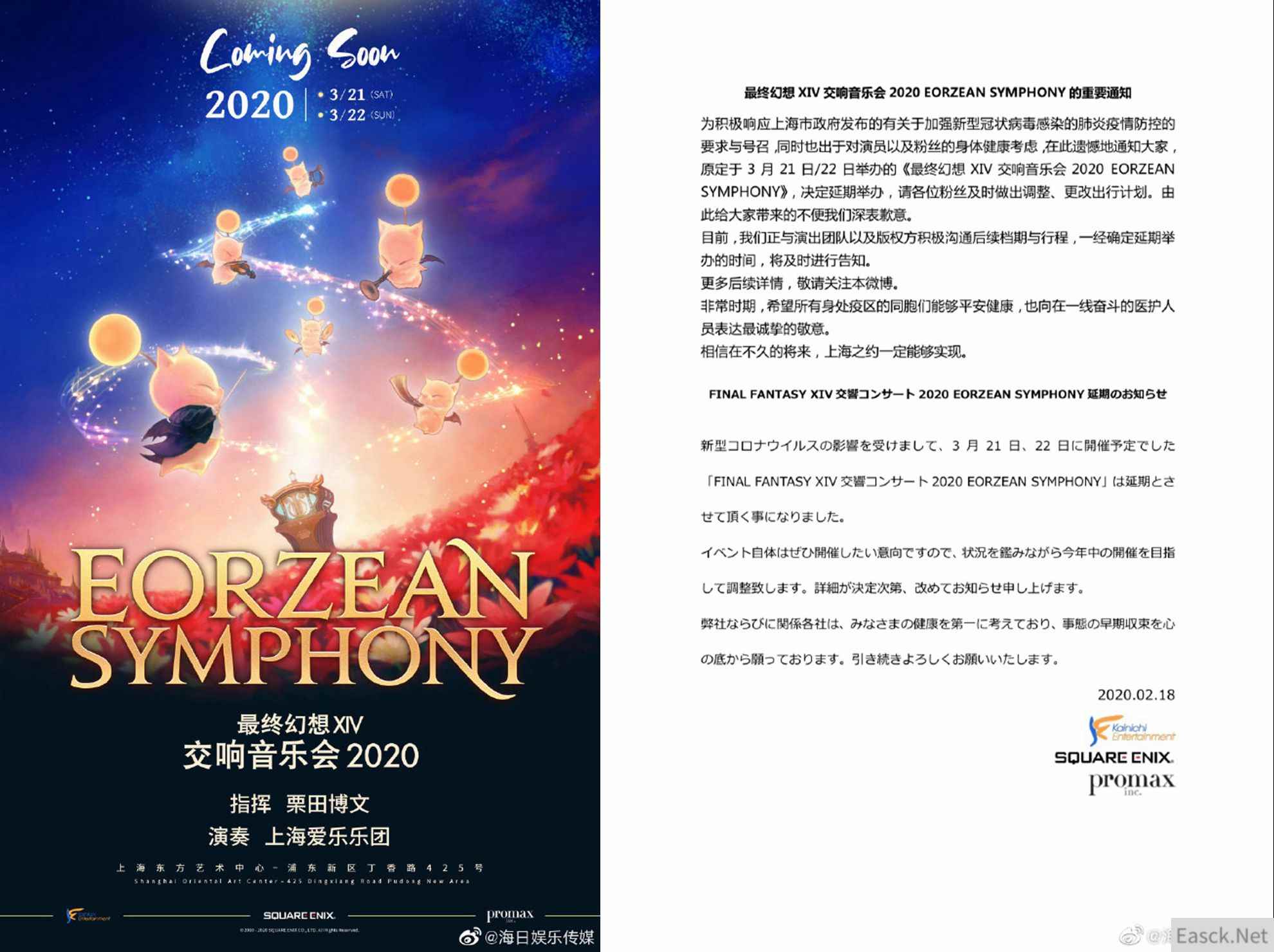 今日(2月18日),《最终幻想14》官方发布通告,出于新冠肺炎疫情的防控要求,原定于2020年3月21日和3月22日的《最终幻想XIV交响音乐会2020 EORZEAN SYMPHONY》延期举办。