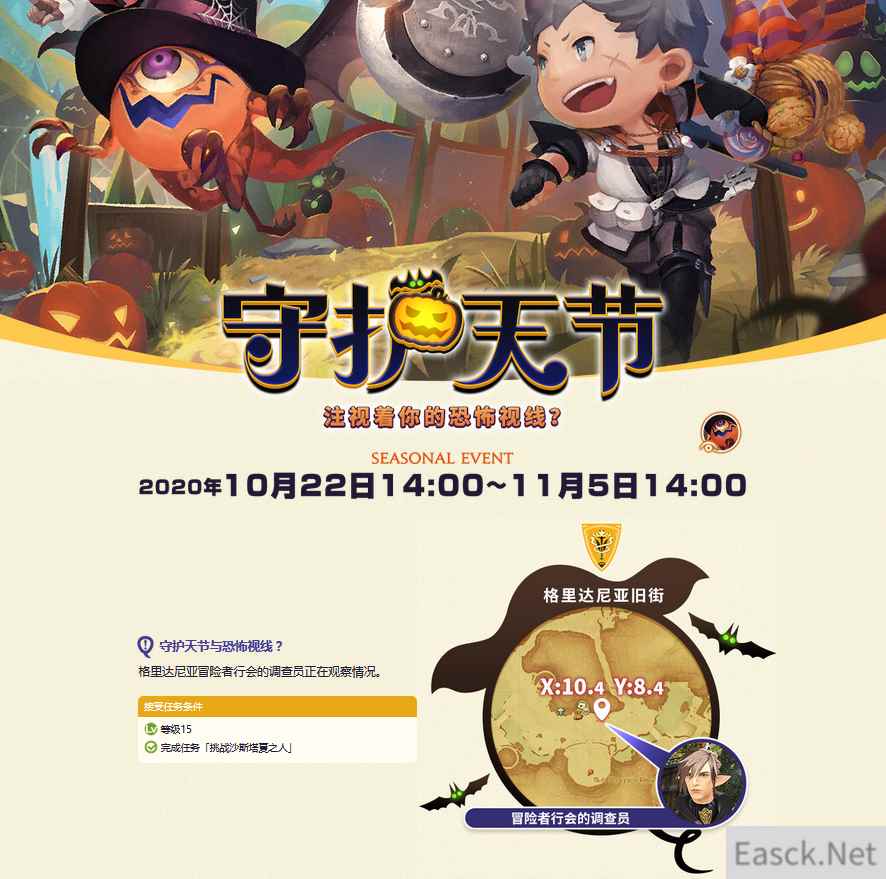 目前,《最终幻想14》官方宣布:“季节活动”守护天节与恐怖视线将于2020年10月22日14:00开启,届时游戏中各个城市和冒险者居住区都使用了南瓜和蝙蝠进行装饰, 旅行艺人众「大陆马戏团」也将远道而来。