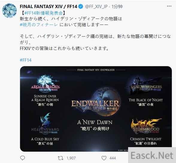 今日(2月6日),《最终幻想14》官方公开了6.0版本全新资料片“晓月之终焉(ENDWALKER)”,目前已经公开该版本标题和首段宣传片,该版本预计2021年秋季上线国际服。此次新版本将加入两个全新职业,一个是治疗职业,另一个是物理近战职业,预计5月会公开物理近战职业的更多新情报。